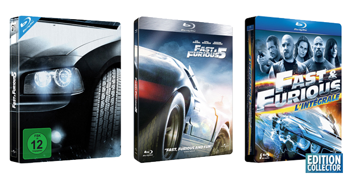 Pour fêter le succès bien mérité en salle de Fast and Furious 5, Universal passe la cinquième en nous proposant pas moins de trois steelbook différent. On commence avec le très joli steelbook allemand en édition limitée qui sera disponible dès le 1er septembre sur amazon.de pour environ 25€. Part contre pour le moment on a aucune info quand a une éventuelle piste audio française. On poursuit avec le magnifique steelbook anglais lui aussi en édition limitée qui sera disponible qu’a partir du 5 septembre sur amazon.co.uk pour un peu moins de 20€. Et même si encore une fois on a pas d’info sur les pistes audio on peut néanmoins s’attendre à avoir une VF comme c’était le cas pour le blu-ray anglais de fast and furious 4. On termine notre petit tour des steelbook avec l’édition française qui sera quand à elle disponible seulement fin septembre sur Amazon.fr, mais proposera l’intégrale de la série (bien que le 6ème épisode a déjà été confirmé) dans un boitier steelbook pour moins de 40€. Personnellement j’ai un petit faible pour l’édition anglaise, au milieu sur la photo, en plus c’est la moins chère.