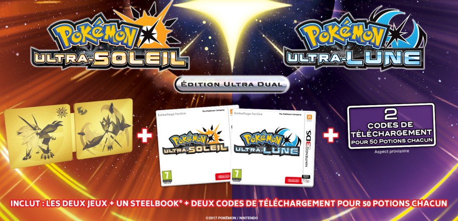 La première et la plus complète des éditions regroupera les deux copies physiques de Pokémon Ultra-Soleil et Pokémon Ultra-Lune avec en bonus un superbe boitier steelbook steelbook doré et deux codes de téléchargement de 50 potions chacun. Par contre, il semblerait que le visuel interne et externe du steelbook sont identique avec Solgaleo et Lunala à chaque fois…