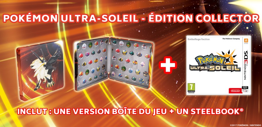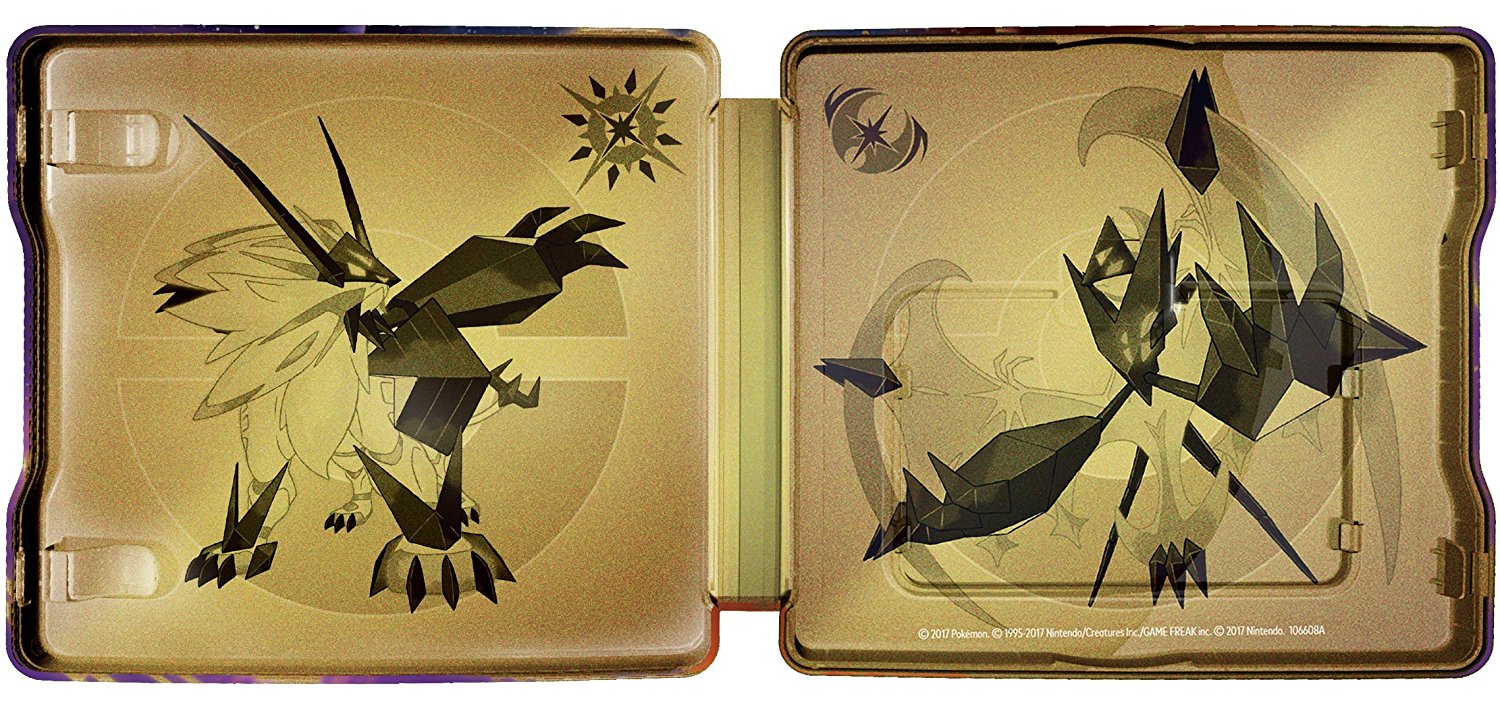Les deux éditions collector suivantes se ressemblent beaucoup puisqu’elles renferment chacune un exemplaire de Pokémon ultra-Lune ou Pokémon ultra-Soleil avec en bonus un boitier steelbook qui semble être identique. En tout cas le visuel interne est clairement le même d’une version à l’autre et les visuels recto verso sont apparemment seulement inversés d’une version à l’autre.