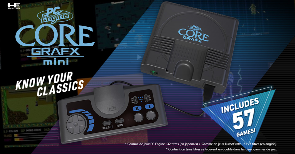 Assez méconnue en France, ce sera enfin l’occasion pour beaucoup de découvrir la machine de NEC sortie début des années 90 avec la manette d’origine (réplique de la même taille) et une sélection jeux intégrés dans leurs versions américaines (comme pour la PS mini et Megadrive). Sinon, on retrouve une fonction pour sauvegarde à n’importe qu’elle moment, une prise HDMI ainsi qu’un mode 5 joueurs simultanés (pour certains jeux) avec un adaptateur (vendu séparément).