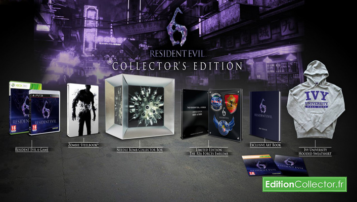 Amazon viens une nouvelle fois de baisser le prix de la version PS3 à moins de 130€ pour le collector de Resident Evil 6. Le jeu débarque dans seulement 2 petites semaines et cette édition collector qui était à la base annoncé à 150€ est également disponible sur Xbox 360 à moins de 140€. Pour rappel celle-ci proposera en plus du jeu, un joli steelbook, un artbook exclusive avec une couverture rigide, un DLC pour télécharger des avatars sur Xbox 360 et un thème pour les possesseurs de PlayStation 3, le sweat à capuche Ivy University certainement en taille L, les insignes des 3 factions auxquels appartiennent les personnages principaux disposés dans un cadre authentifié par les signatures du producteur Hiroyuki Kobayashi et des deux directeurs Eiichiro Sasaki et Yoshiaki Hirabayashi. L’ensemble sera rangé dans une superbe boite aux faces lenticulaires donnant l’impression de renfermer une Bombe Needle.