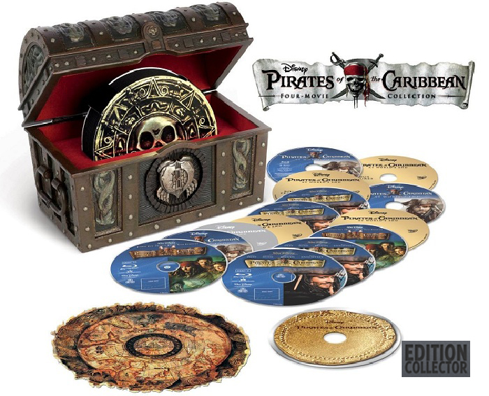 Sortie il y a moins d’un mois au cinéma et déjà annoncé à la vente, le dernier volet de la quadrilogie Pirates des Caraïbes va embarquer à son bord un magnifique coffret collector reprenant l’intégral des aventures de notre pirate préféré. Annoncé uniquement pour le territoire des USA, ce coffret sera commercialisé aux alentours de 170$, mais on peut déjà le trouver à moins de 115$ sur la version américaine d’Amazon. L’ensemble comprendra :