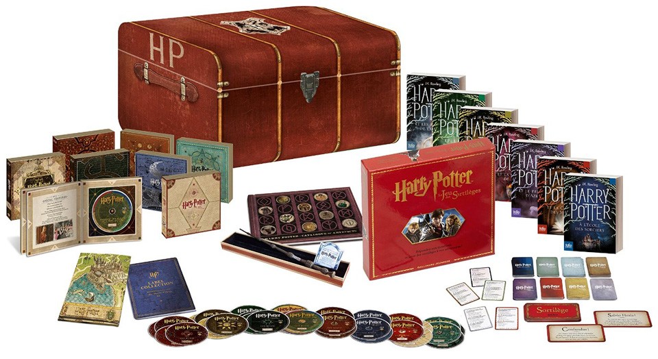Pour finir, il a également une nouvelle version du fameux coffret ultime. Pour l’instant, on sait simplement que celui-ci renfermera les 7 livres, le jeu de plateau, un catalogue d’accessoires de 48 pages, un catalogue d’étiquettes de 32 pages, une carte de Poudlard en tissu, une baguette magique ainsi que l’intégrale des films en DVD, Blu-ray et Blu-ray 3D le tout dans une coffret en forme de malle.