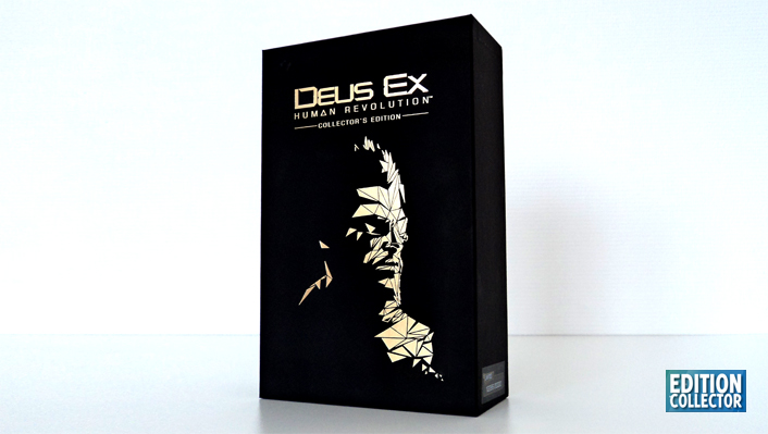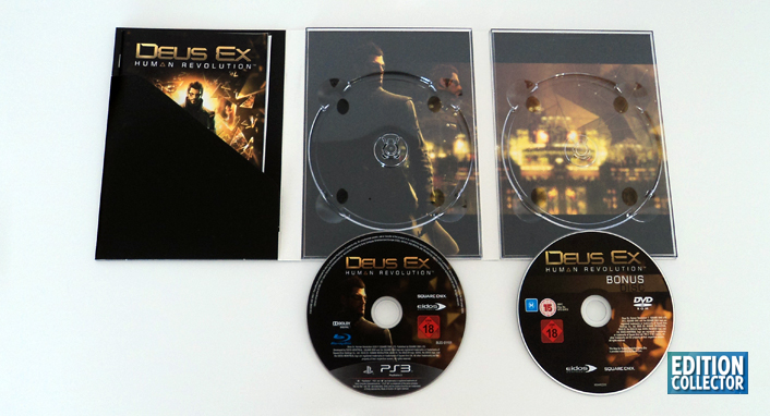 Commençons ce petit déballage par la boite de cette édition collector. Toute revêtue de noire la boite en carton respire la sobriété et son imprimé doré d’Adam Jensen sur la face est du plus belle effet. Un petit autocollant nous indique que cette édition est bien une version limitée numérotée. Dommage que des marques apparaissent dans les angles de la boite à cause des points de colle qui fixaient le feuillet publicitaire du jeu…