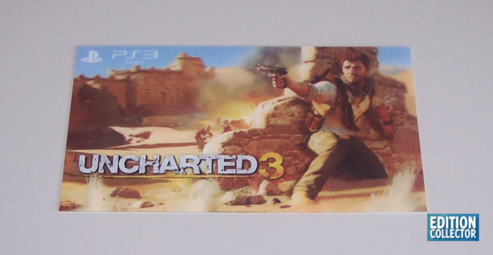 Un sticker lenticulaire est également inclus et pour une fois je trouve que l’effet de flou 3d est vraiment sympa. Enfin, on termine avec la figurine de Nathan Drake qui comme souvent avec les édition collector de jeux vidéo, propose un visage pas franchement réussi. Et c’est bien dommage d’autant que le reste de la figurine et plutôt bien réaliser avec pas mal de détails.