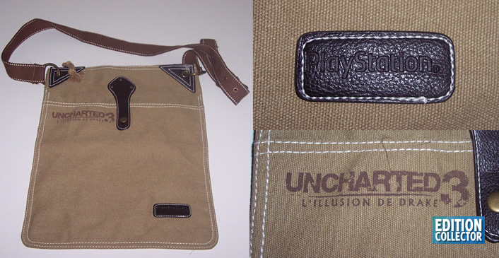 Voilà pour le déballage de l’édition collector Uncharted 3 et comme j’ai pré-commander mon édition explorer sur la Fnac j’ai reçu en plus en début de semaine la besace Uncharted 3. “Offert” pour 1€ de plus elle vaut largement sont pesant de cacahuète et j’adore le logo Playstation embosser sur un morceau de cuir. Au final, je m’attendais à du lourd et là je ne suis pas déçu avec un coffre vraiment magnifique, une figurine très sympa, une édition spéciale vraiment original et des goodies de bonnes qualités… et puis évidemment un jeu vraiment excellent, d’ailleurs hop je retourne en prendre plein les mirettes.