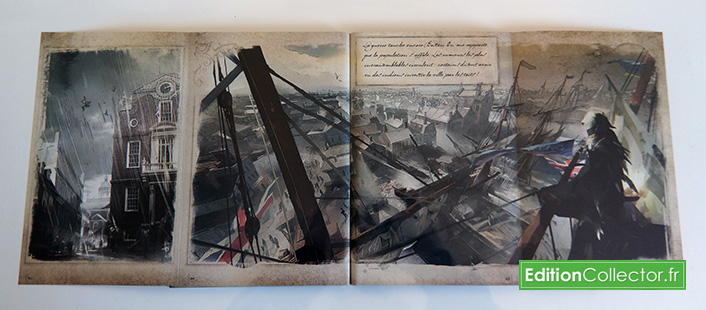 Certaine page ce déplie et dévoile de magnifique artwork, part contre plusieurs pages dépliante de mon exemplaire ont été attrapés par la machine qui relie les pages du coup impossible de les ouvrir a moins de donné un coup de cutter! Un comble pour un livret d’une telle qualité… Mea-culpa puisque finalement le défaut de fabrication n’en n’est pas un! Ce sont en fin de compte des pages secrètes qu’il faut découpé avec un cutter ou directement avec le marque page en forme de lame.