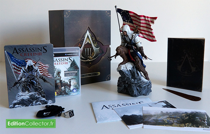 Et voilà, comme d’habitude je termine avec une petite photo regroupant tout le contenu de cette édition Freedom d’Assassin’s Creed 3. Perso je trouve cette édition collector vraiment sublime avec une très belle boite, un joli steelbook, un petit livret vraiment très riche et une superbe figurine! Pour pinailler un peu je dirais qu’il manque tout de même le médaillon de Connor que l’on trouve uniquement dans l’autre édition collector et un artbook digne de ce nom. Mais pour ce dernier il sera tout de même possible d’acheter le livre (en français) de 200 pages Tout l’art de Assassin’s Creed 3 qui sortira dans quelques semaines sur Amazon pour 25€. Bon maintenant me reste plus qu’a m’équiper de mon tomahawk ma manette pour prendre part à la révolution Américaine…