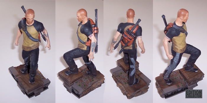 Viens ensuite la figurine de Cole, le héros (ou méchant) du jeu pour ceux qui débarquent d’une autre planète. La figurine n’est pas très grandes puisqu’elle doit faire la taille d’un boiter dvd. Malheureusement on voit un peu trop à mon goût les jonctions des bras et des jambes sans compter que mon exemplaire à une jolie coulure de colle glue sur son torse. Bon ok je chipote un peu puisqu’il faut vraiment zieuté de près pour la voir. Reste néanmoins une statue plutôt bien détaillé avec les tatouages ou les pansements sur les doigts ou encore le sac à dos. Et puis j’aime beaucoup le socle même s’il est creux il donne une certaine classe à l’ensemble.