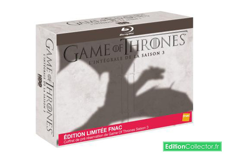 En plus du superbe coffret collector de la saison 3 de Game of Thrones, la série bénéficiera également d’une édition limitée ainsi que d’un coffret spécial Fnac comme cela avait été le cas pour les saisons précédentes. Pour le coffret de pré-réservation Fnac on retrouvera comme d’habitude dans une belle boite la carte cadeau pour l’achat en février prochain du blu-ray de la troisième saison, le tome 3 de 1149 pages de George R.R. Martin qui a inspiré la série ainsi qu’un petit avant-goût avec le premier épisode de cette saison en blu-ray. Par contre, petite précision concernant le bouquin qui contrairement aux autres tome couvre également la saison 4 puisque les 10 épisodes de la saison 3 ne développent que la première moitié du livre! Prévu pour le 4 décembre prochain, ce coffret spécial Fnac de la saison 3 de Game of Thrones est disponible en pré-commande pour moins de 50€ dans sa version blu-ray et 40€ en DVD avec en plus 10€ en bon d’achat pour les adhérents carte Fnac.