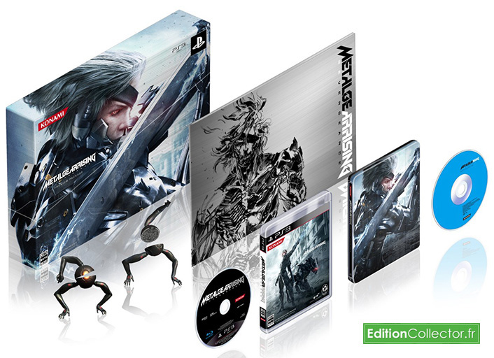 Bien que Metal Gear Rising : Revengeance n’est pas attendu avant l’année prochaine, Konami a déjà dévoilé une édition collector Japonaise et une édition limitée pour les Américains. La première sobrement appelée Premium Package proposera le jeu accompagné d’un très joli boiter steelbook, de la bande originale du jeu sur CD, un artbook qui s’annonce fin comme une lame de rasoir d’après le visuel, 2 petites figurines de robot sentinelle et du DLC Cyborg Ninja qui permettra de télécharger un skin inspirée de Gray Fox pour Raiden. A noté qu’une version Konami style Special Edition proposera le même contenu avec en plus une figurine articulée Play art kai de Raiden en armure blanche. Uniquement disponible sur la boutique de Konami, ces deux éditions seront disponibles dès le 21 février prochain pour respectivement moins de 100€ et 130€ avec la figurine. En ce qui concerne l’édition limitée américaine, aucun visuel du contenu n’a été dévoilé, mais on sait déjà que celle-ci comprendra au moins un boitier steelbook, la bande originale du jeu et une magnifique lampe plasma avec l’épée haute fréquence de Raiden à l’intérieur. Prévu pour le 19 février prochain, cette édition limitée de Metal Gear Rising est déjà disponible sur Amazon.com en pré-commande pour 150$ (environ 116€). Maintenant espérons que la France ne sera pas oubliée !