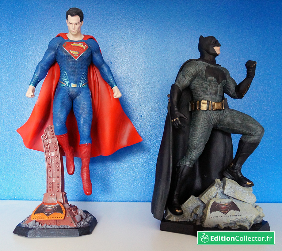 Le seul point commun avec les coffrets français, c’est bien entendu les figurines entièrement en résine qui autant dire tout de suite sont plutôt réussite dans l’ensemble. Alors certes, le visage de Superman n’est pas très détaillé et ressemble vaguement à celui d’Henry cavill. Néanmoins, il a le mérite de pas a voir un regard de demeuré contrairement a ce que pourrait laisser penser les photos… De son coté, Batman à un regard nettement mieux foutu, mais c’est du coté de la bouche/mâchoire que ce n’est pas tip top même si pour le prix ça fait le job.