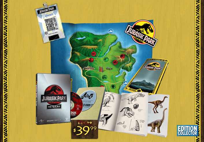 Après avoir revisité la série Retour vers le futur, le studio Telltale Games s’attaque désormais aux dinosaures du célèbre Jurasic Park. Le jeu sera découpé en 4 épisodes disponible sur les plate formes de téléchargements pour PC/Mac, PSN et Xbox Live dès le 15 novembre prochain. Son édition deluxe exclusive pour PC/Mac sera quant à elle disponible dès le 4 décembre pour 50$via la boutique en ligne de l’éditeur, mais vous économiserez 10$ si vous pré-commandez le titre. Pour ce prix vous bénéficierez d’une boite exclusive avec les 4 épisodes sur DVD, la réplique d’un badge d’identification d’InGen, une brochure du parc, un écusson du logoJurassic Park à coudre, un guide InGen de 32 pages faisant certainement office d’artbook et du contenus numérique à télécharger, dont la BO et un making-of. A noter que si vous pré-commandez cette édition vous pourrez télécharger gratuitement les épisodes dès leurs sorties respectives avant de recevoir votre exemplaire physique juste à temps pour les fêtes de fin d’année.