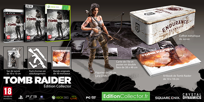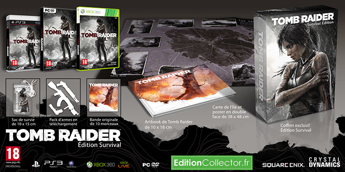 Déjà dévoilé par Square Enix il y a plus d’un mois maintenant, l’édition Survival et l’édition collector de Tomb Raider se voit enfin illustré en image. Pour rappel l’édition Survival proposera en plus du jeu un mini artbook de 32 pages au format boitier DVD réalisé par le directeur artistique du jeu, la carte de l’île mystérieuse où Lara a échouée et un poster au verso, un sac de survie étanche ou tout du moins une pochette de survie d’après le visuel, 1 DLC pour télécharger un pack d’armes exclusif et pour finir le CD de la bande originale du jeu. Cette édition est disponible en pré-commande pour moins de 70€ sur console et 60€ sur PC.