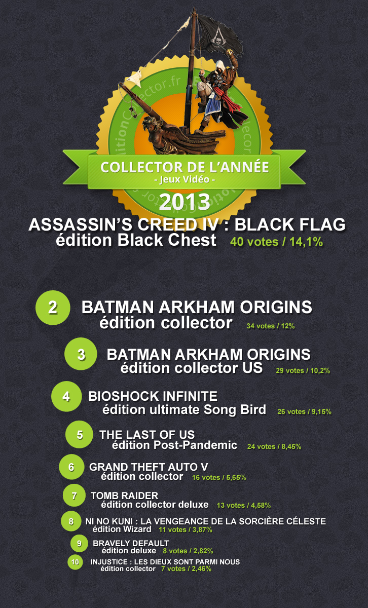 Un peu surpris du top Collector Consoles. Assassin’s Creed 4 est populaire, d’où le nombre de votes, mais est largement concurrencé en la matière. Je me contente de voir The Last of Us & BioShock Infinite ! 🙂