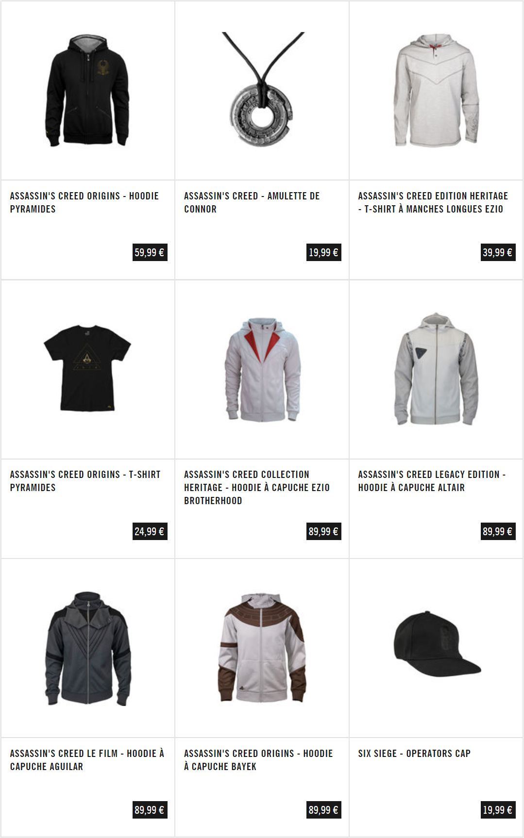 Pour l’instant, la version française ne propose que quelques vêtements et uniquement deux accessoires dédiés à Assassin’s Creed, mais nul doute que cela va vite se remplir comme sur la version US qui a elle aussi fait peau neuve récemment. Et autant dire que le nombre d’accessoires et vêtements est vraiment impressionnants avec des collections entière dédiées à Far Cry, For Honor, Ghost Recon, The Division, Watch-Dogs et Assassin’s Creed. Autant dire que l’on est impatient que tous cela arrive vite chez nous aussi, surtout qu’ils proposent de temps en temps des goodies exclusif comme par exemple la dague de Takkar dans Far Cry Primal ou encore des éditions limitées…