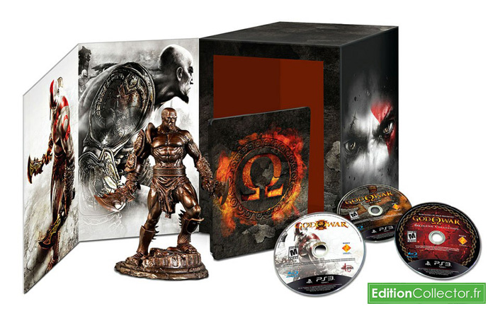 Prévu pour le 13 mars prochain, God of War Ascension débarquera avec une édition collector. Aucun visuel n’a été dévoilé pour le moment, néanmoins on sait que le coffret contiendra le jeu dans un boitier steelbook, une figurine de Kratos, la bande originale en version numérique, un thème dynamique et un pack d’avatars pour PS3, un bonus d’xp pour le multi et un season passe gratuit qui donnera accès à tous les contenus téléchargeables à venir. Je croise les doigts pour que Sony s’inspire le plus possible de l’édition Oméga ci-dessous