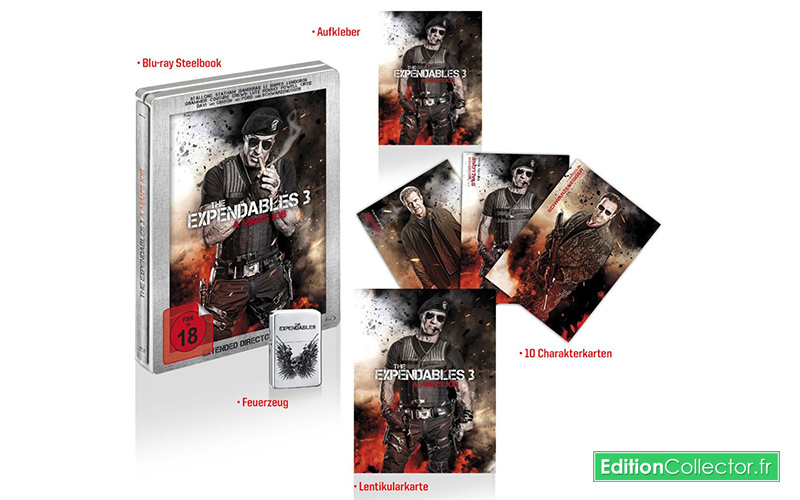 De son côté, la version anglaise sera nettement plus sobre avec un boitier steelbook noir mat vraiment sympa et plutôt bad ass avec les trois crânes ! Au verso, on a droit à sly en train de poser tranquillement avec son cigare et ses deux flingues, mais certainement après avoir fait 200 pompes histoire de faire ressortir un max les veines ! En ce qui concerne le film en lui-même, c’est toujours la même rengaine avec Lionsgate en Angleterre puisque aucune piste audio ni sous-titre français ne sera inclus sur la galette. M’enfin ça ne l’empêche pas d’être un très beau boitier steelbook déjà disponible depuis quelques jours pour moins 28€ sur Zavvi. Reste enfin la version allemande qui elle aussi joue sur la continuité avec les précédents opus déjà sortie outre Rhin. Mais à l’occasion de ce troisième épisode, Amazon.de proposera en plus du steelbook à l’unité à seulement 18€, une petite édition limitée nommée Héros Pack. Cette dernière renfermera bien évidemment le steelbook du film accompagné d’un magnet lenticulaire, d’un zipo Expendables, de trois cartes 3D ainsi que le poster du film le tout en pré-commande pour moins de 30€ ! Mais toujours pas de piste ni de sous-titre en français.