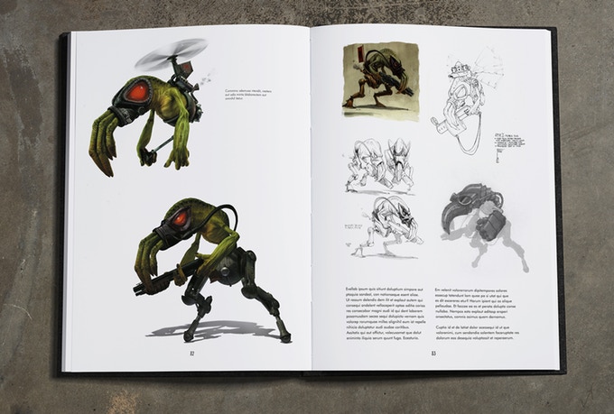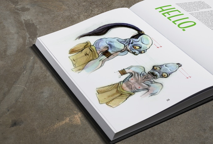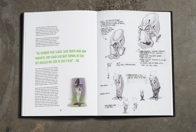 Ce dernier renfermera environ 240 pages de bonne épaisseurs (papier d’art mat 160g/m²) avec des centaines d’illustrations conceptuelles fraîchement mises à jour ainsi qu’une tonne de documents et croquis originaux sans oublier de nouvelles interviews avec les développeurs d’Oddworld. Le livre en lui même sera dans un format un chouïa plus petit que l’A4, mais disposera d’une couverture rigide gaufré (en relief) et avec du vernis brillant sur Abe et sera accompagné d’un marque page inédit (on peu voter pour son design sur la page de la campagne) !