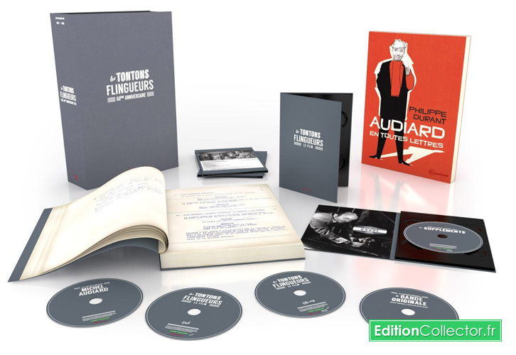 À l’occasion du 50ème anniversaire du film Les Tontons flingueurs réalisé par Georges Lautner, Gaumont nous a concocté une superbe édition collector limitée à seulement 5000 exemplaires ! Cette dernière renfermera dans un grand coffret gris numéroté le blu-ray du film accompagné d’un second blu-ray de bonus supplémentaires, du CD de la bande originale, le scénario reproduit dans son intégralité soit plus de 608 pages de dialogue et enfin le livre Audiard en toutes lettres de Philippe Durant d’environ 290 pages. À noté que les disques seront rangés dans des digipack cartonnés. Prévu pour le 27 novembre prochain cette édition 50ème anniversaire des Tontons flingueurs est encore disponible en pré-commande pour moins de 120€ sur Amazon et la Fnac. D’ailleurs il est plus intéressant de prendre le coffret à la Fnac si vous êtes adhérents puisque l’enseigne offre 20€ en chèque cadeau pour toutes pré-commandes. Au final cette édition s’annonce vraiment pas mal pour ce classique de 1963, m’enfin il reste encore un petit peu cher à mon goût malgré qu’il soit plutôt bien garni.