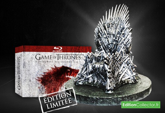 Warner Bros propose actuellement sur sa boutique en ligne un superbe coffret exclusif de la série Game of Thrones (Le Trône de Fer). Celui-si renfermera l’intégrale des deux premières saisons de la série en blu-ray ou DVD ainsi qu’une imposante réplique d’une valeur de 60€ du fameux Trones de Fer à l’échelle 1/10ème soit environ 21cm par 23cm. Prévu pour avril prochain, cette édition collector sera fabriqué en série très limitée de 200 exemplaires à condition que les 200 coffrets soit acheté avant le 8 février prochain, sinon cette édition ne verra tout simplement pas le jour! Le coffret est pour le moment encore disponible en version dvd pour moins de 100€ et en version blu-ray pour 110€. Mais si vous êtes fan de la série il va falloir se décider rapidement, car à l’heure où j’écrit ces lignes il ne reste déjà plus que 64 exemplaires de la version DVD et 90 exemplaires de la version blu-ray!