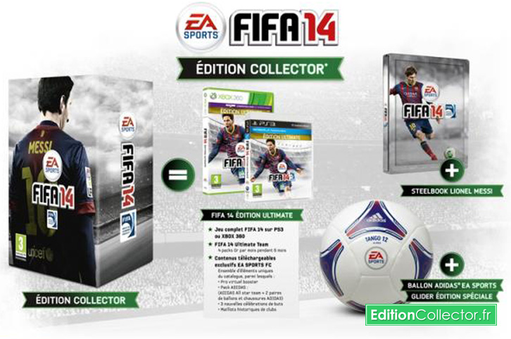 Comme toutes les années la nouvelle itération du jeu de football made in EA Sports (it’s in the Game!) débarquera sur nos consoles pour la rentrée prochaine. Pour l’occasion FIFA 14 n’échappera pas à la mode actuelle et proposera une édition collector ainsi qu’une ribambelle de boitier steelbook. On commence bien sûr par le collector qui refermera le jeu accompagné d’un joli boitier steelbook avec Messi en couv’, un ballon Adidas glider exclusif ainsi que 24 pack or pour Ultimate Team (ou plutôt 1 pack par semaine). A noté également que c’est la version ultimate du jeu qui est inclus dans le collector et cette dernière propose en bonus un DLC exclusif pour télécharger 2 paires de chaussures, 2 ballons, l’équipe adidas All-Star, 5 bonus Pro différents pour améliorer les stats de vos joueurs, un accès immédiat à 3 nouvelles célébrations de but ainsi qu’une collection de maillots historiques. Prévu pour le 27 septembre prochain sur PS3 et Xbox 360 l’édition collector de FIFA 14 est d’ores et déjà disponible en pré-commande pour moins de 110€ exclusivement chez Micromania. Et pour toutes pré-commande l’enseigne offre un T-shirt exclusif Ultimate Team dans la limite des 3000 pièces dispo, mais il semblerait qu’il en reste encore.