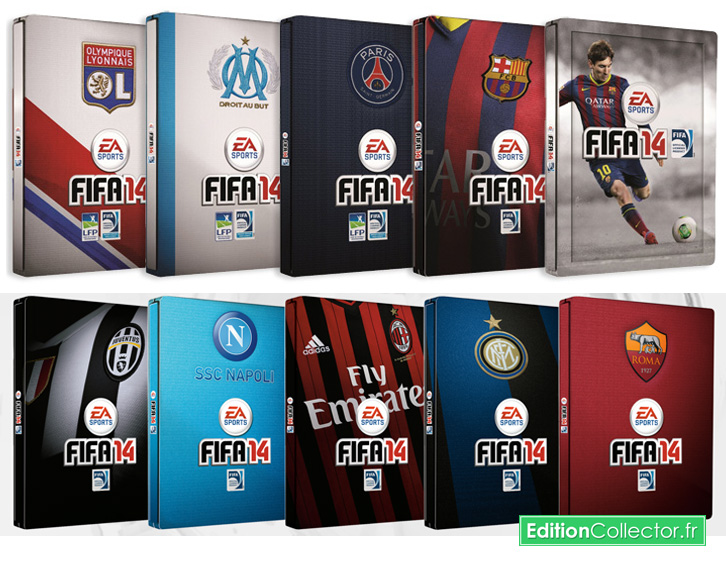Egalement au programme on retrouvera les fameux boitiers steelbook aux couleurs des clubs de football français, italien et espagnol. Malheureusement pour certains supporters, tous les clubs ne sont pas représentés. Seul celui du Paris saint Germain, de L’olympique Lyonnais, de L’olympique de Marseille, du FC Barcelone ainsi que le spécial avec Messi seront disponibles en France pour 20€ pièces! Néanmoins, Amazon.fr offre le steelbook de votre choix pour toutes pré-commandes de l’édition ultimate de FIFA 14. Par contre, si vous avez une petite préférence pour les clubs italiens vous avez le choix entre celui de la Juventus, l’AS Rome, le SSC Naples, l’AC Milan et l’Inter de Milan, mais dans ce cas il faudra passer par l’import. De plus ils ne sont pas disponibles à l’unité, seul Gamestop.it les proposent pour toutes réservations du jeu! Enfin bref, certain l’auront certainement déjà compris, la meilleure solution pour s’offrir les steelbook italien ou même toutes la collection des steelbook français sera de faire un petit tour sur ebay après la sortie du jeu.