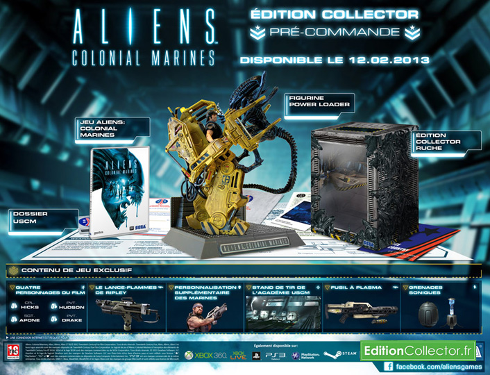 Alors qu’un visuel avait déjà fuité en janvier dernier, l’édition collector de Aliens Colonial Marines viens enfin d’être officiellement confirmé par SEGA sur consoles de salon. Désormais prévu pour le 12 février 2013, cette édition collector proposera bien évidemment le jeu, mais également une magnifique figurine en résine d’un Alien en train d’attaquer un marine dans son Powerloader. On trouvera également dans la belle grosse boite prévue pour l’occasion un dossier USCM comprenant un briefing de mission, les plans de l’USS Sephora, une carte de recrutement, une photo de reconnaissance de la planète LV-426, des badges USCM, un diplôme militaire de l’USCM et comme d’habitude pour finir quelques dlc afin de télécharger quatre personnages jouables tirés des films (Hudson, Hicks, Drake et Apone), des options de personnalisation supplémentaires pour vos marines, le lance-flammes de Ripley ainsi que des armes exclusives pour le multijoueur et un niveau bonus nommé USCM Academy Firing Range. Actuellement disponible en pré-commande sur Amazon.com pour 100$ sur PS3 et Xbox 360 on attend évidemment avec impatience le moment ou l’on pourra réserver une version française. En attendant je vous laisse saliver sur quelques photo prises à l’E3 2012.