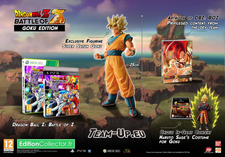 D’abord annoncée pour la fin d’année, il faudra finalement attendre la nouvelle année pour revoir débarquer sur nos consoles Goku, Vegeta et tous les autres dans le nouveau Dragon Ball Z : Battle of Z. Et pour l’occasion Namco Bandai nous a concocté une sympathique édition collector, baptisée Goku Edition. En plus d’un exemplaire du jeu sur PS3 ou Xbox 360 cette dernière renfermera également une figurine exclusive de Goku en Super Saiyan d’environ 25cm de haut, un artbook remplie d’artwokrs des développeurs ainsi qu’un costume exclusif in-game de Naruto en Mode Ermite pour Son Goku. À noter pour ceux qui n’ont pas trop suivie l’actualité du jeu, cette nouvelle version de DBZ apporte principalement la possibilité de jouer jusqu’à huit simultanément, à raison de quatre par équipe. Prévu en Europe pour le 24 janvier prochain, cette édition limitée de Dragon Ball Z : Battle of Z n’est pas encore disponible en pré-commande. Néanmoins, comme d’habitude cela ne devrait plus trop tarder maintenant que Namco l’a annoncé officiellement via communiqué de presse.
