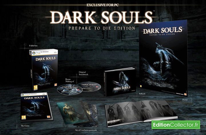 Après avoir écouté les nombreux joueurs qui demandaient que l’excellent Dark Souls sorte également sur PC, les développeurs japonais ont finalement reconnu avoir eu de grandes difficultés pour le portage de leur jeu. Du coup la version PC ne proposera aucune amélioration graphique par rapport aux versions consoles. Néanmoins, le studio From software proposera au PCistes une sympathique édition collector sous-titré Prepare to die qui inclura en plus un chapitre encore inexploré du monde de Lordran, des nouveaux boss, des nouvelles régions, de nouveaux ennemis, des nouveaux PNJ et enfin des nouvelles armes et armures. Mais ce n’est pas tout puisque cette édition proposera également un petit artbook de 150 pages, la bande-son originale sur CD, un DVD contenant toutes les vidéos du making of, un poster et des cartes postales. Prévu pour le 24 août prochain cette édition collector est déjà disponible en pré-commande pour moins de 50€ sur Amazon. Part contre même si on sait qu’un DLC vendu autour des 10-15€ est prévu cet hiver sur consoles pour apporter les mêmes nouveautés que la version PC, on ne sait pas encore si une édition Prepare to die sortira également sur PS3 et Xbox 360.