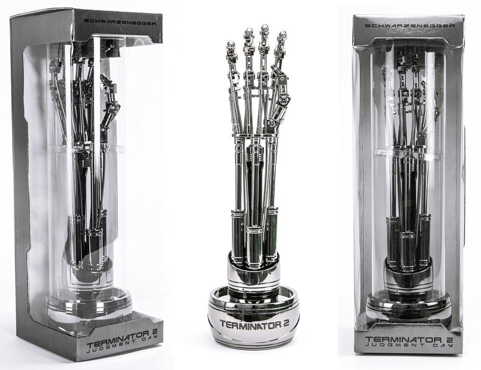 Déjà en rupture depuis plusieurs semaines maintenant, l’édition collector de Terminator 2 avec la fameuse réplique de l’avant bras du T800 commence enfin à se dévoiler avec quelques photos (merci à Samy060 pour l’info) ! L’occasion de voir que celui-ci est recouvert d’une bonne couche de chrome brillant qui à défaut d’imiter parfaitement le métal rend plutot bien.