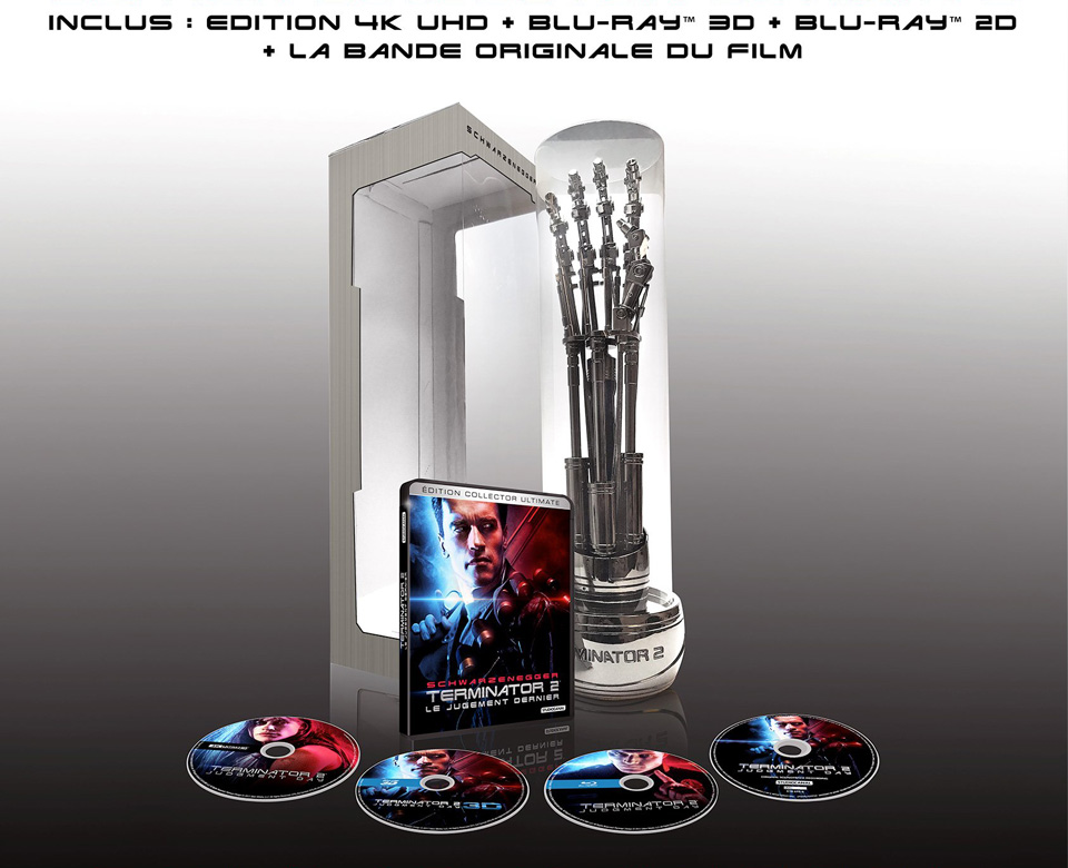 Voilà l’attente n’aura pas durée longtemps, le collector, le steelbook et la version 4K de Terminator 2 sont déjà disponible en pré-commande sur Amazon et la Fnac ! A noter que l’on apprend par la même que le bras du T-800 est évidemment en plastique, mais que le coffret pèse tout de même plus de 3Kg et qu’il sera bien numéroté à 1500 exemplaires en France !