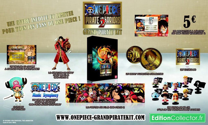 A l’occasion de la sortie de One Piece : Pirate Warriors 2 à la fin du mois Namko Bandai propose actuellement pour les fans du jeu un Kit de Pirate. Le coffret dispo en édition limitée contient un buste de 10cm aléatoirement choisi parmi l’un des 9 personnage de la série, un bon de réduction de 5€ valable pour l’achat du jeu One Piece Pirate Warriors 2, une pièce de 500 Berry numéroté et inédite, le costume de Luffy dans le film One Piece Z à télécharger sur le PSN, un sticker repositionnable de Chopper, un tatouage et un long poster du film One Piece Z, un ticket Gold à gratter pour peut-être gagner un voyage au Japon et enfin un coupon de réduction pour le concert symphonique de One Piece. L’ensemble est disponible depuis quelques jours pour moins de 15€ sur Amazon et la Fnac