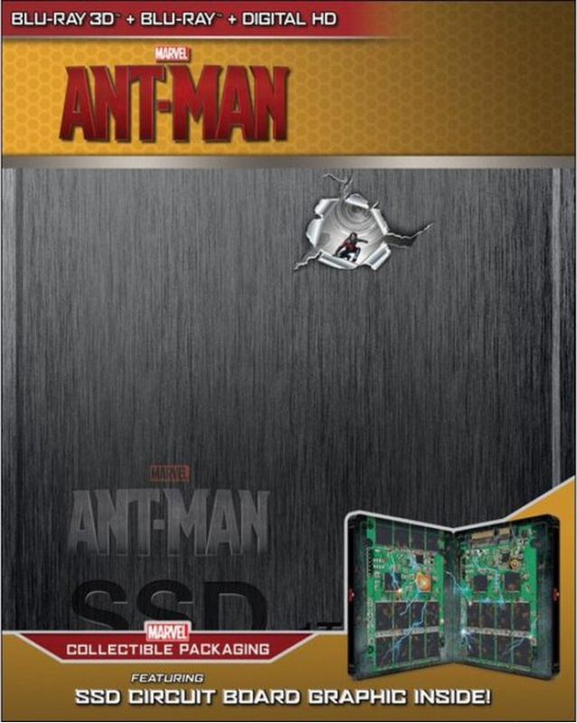 Et après le steelbook à l’aspect d’une K7 audio pour les Gardiens de la Galaxie, Disney nous a concoctés cette fois un steelbook d’Ant-Man en forme de disque dur SSD ! On retrouvera du coup à l’intérieur un double visuel des cartes électroniques avec les puces mémoires comme à l’intérieur d’un vrai SSD. Et le moins que l’on puisse dire, c’est qu’une fois de plus l’idée est vraiment très originale, avec même un peu d’humour puisque l’on peut voir Ant-Man dans un trou de balle !