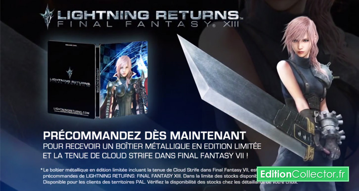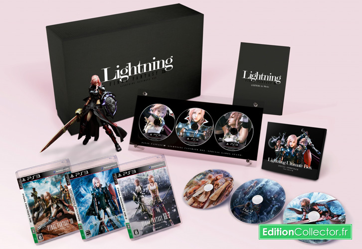 Alors que Lightning Returns : Final Fantasy XIII débarque dès demain au Japon, il faudra de notre côté encore attendre quelques mois avant de mettre la main sur le jeu. Et pour nous narguer encore un peu plus, nos amis nippons bénéficient pour l’occasion d’une superbe édition collector ultimate box dévoilé l’été dernier qui contiendra la trilogie au complet (mais uniquement en japonais) ainsi qu’un plexi pour exposer les disques, la bande son sur CD, un artbook et une figurine Play Arts Kai de Lightning ! Autant dire que malgré le prix élever tous est partie comme des petits pains. Et du coup on retrouve le coffret sur ebay a plus de 500€ ! Pour l’Europe, Square Enix n’a pas encore prévu de collector similaire avec la trilogie, mas simplement un boitier steelbook limitée de Lightning Returns en bonus de pré-commande. Celui-ci contiendra également un code pour télécharger du contenu exclusif avec la tenue légendaire de Cloud Strife, le héros de FINAL FANTASY VII ainsi que la fameuse Épée broyeuse et le brassard SOLDAT. Prévu pour le 14 février prochain, le steelbook de Lightning Returns : Final Fantasy XIII est encore disponible en pré-commande pour moins de 60€ uniquement sur la boutique de Square Enix France. A noter pour finir que la figurine Play Arts Kai de Lightning présente dans le collector Japonais est également disponible en France à l’unité en pré-commande pour moins de 85€ sur Amazon avec une date de sortie prévu pour décembre prochain.