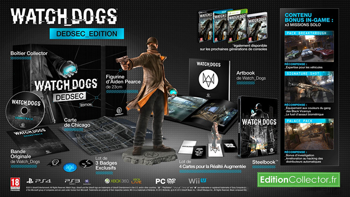 Avec les publications cette semaine dans la presse spécialisée de préviews largement positives sur son jeu, Ubisoft compte bien profiter de l’occasion pour mettre les bouchées doubles sur la promo de Watch_Dog. D’autant plus qu’il ne reste qu’un petit mois seulement pour rattraper le bad buzz généré autour du léger downgrade graphique opéré depuis l’E3 dernier et surtout du retard de 7 mois ! Et quoi de mieux qu’un premier unboxing de l’édition limitée américaine de Watch_Dog pour reconquérir le cœur des fans. Même si la mise en scène nous plonge directement dans l’ambiance du jeu, on notera que cette édition collector ressemble pas mal à la nôtre, avec néanmoins quelques petites subtilisées. Déjà tout comme notre édition DEDSEC, l’édition limitée us contiendra également la jolie figurine d’Aiden Pearce de 23cm de haut, ainsi que le même artbook qui comme on peut le voir dans la vidéo n’est vraiment pas ridicule niveau taille puisque à vu d’œil il doit faire 21cm x 21cm et renfermera 80 pages. La bande originale et le boitier steelbook sont également de la partie, même si pour ce dernier les visuels sont dans un style complètement différent. Perso j’ai une petite préférence pour la version européenne, néanmoins le visuel avec le logo des hackers sur le steelbook us est vraiment super sympa également. Reste comme différence, le Foulard d’Aiden Pearce dans le coffret us tandis qu’à la place, on aura la carte de la ville de Chicago tel qu’elle est dans le jeu ainsi que 3 Badges exclusifs et 4 cartes pour la réalité Augmentée le tout rangé dans un coffret nettement plus grand et plus classe que la petite boite us aperçu dans la vidéo. Prévu pour le 27 mai prochain, l’édition limitée us de Watch_Dog est encore disponible en pré-commande pour environ 125€ en comptant les frais de port et les douanes. Soit sensiblement le même tarif demandé pour l’édition DEDSEC européenne de Watch_Dog puisqu’on la trouve encore en pré-commande pour moins de 120€. Étant donné que les deux éditions sont pratiquement au même prix, laquelle préféré-vous ?