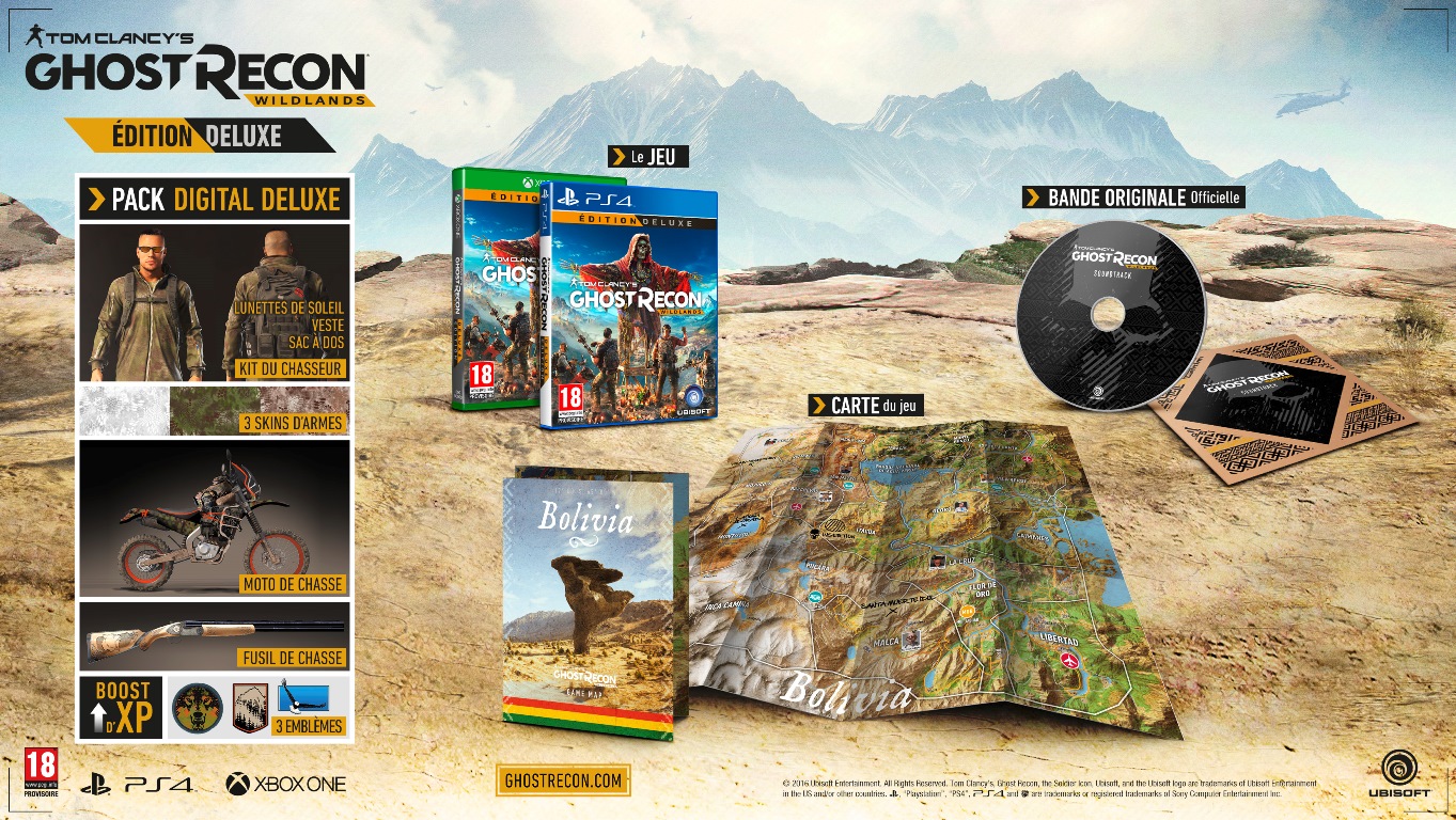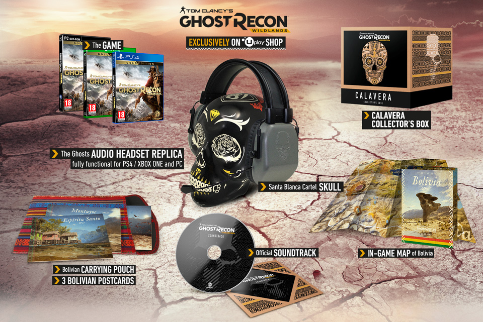 Toujours sans date de sortie officielle, le collector renfermera dans une belle grosse boite exclusive une réplique du casque audio avec micro des Ghosts accompagné du crâne du Cartel de Santa Blanca pour le ranger dessus en fin de partie ! Sinon le coffret inclut également le Season Pass ainsi qu’a une belle pochette bolivienne avec 3 cartes postales de la Bolivie.