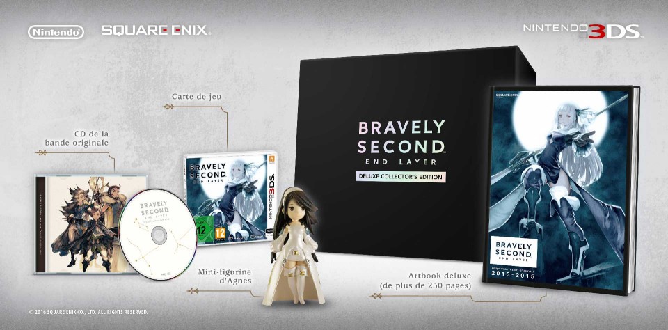 En effet, cette dernière renfermera dans un joli coffret noir le jeu Nintendo 3DS sous-titré Bravely Second : End Layer chez nous avec en bonus une mini-figurine d’Agnès de 10cm de haut, le CD de la bande originale avec son boitier cristal ainsi qu’un véritable artbook deluxe de plus de 250 pages ! En plus, il semble bel et bien être au format A4 avec une couverture rigide si l’on se fie au visuel.