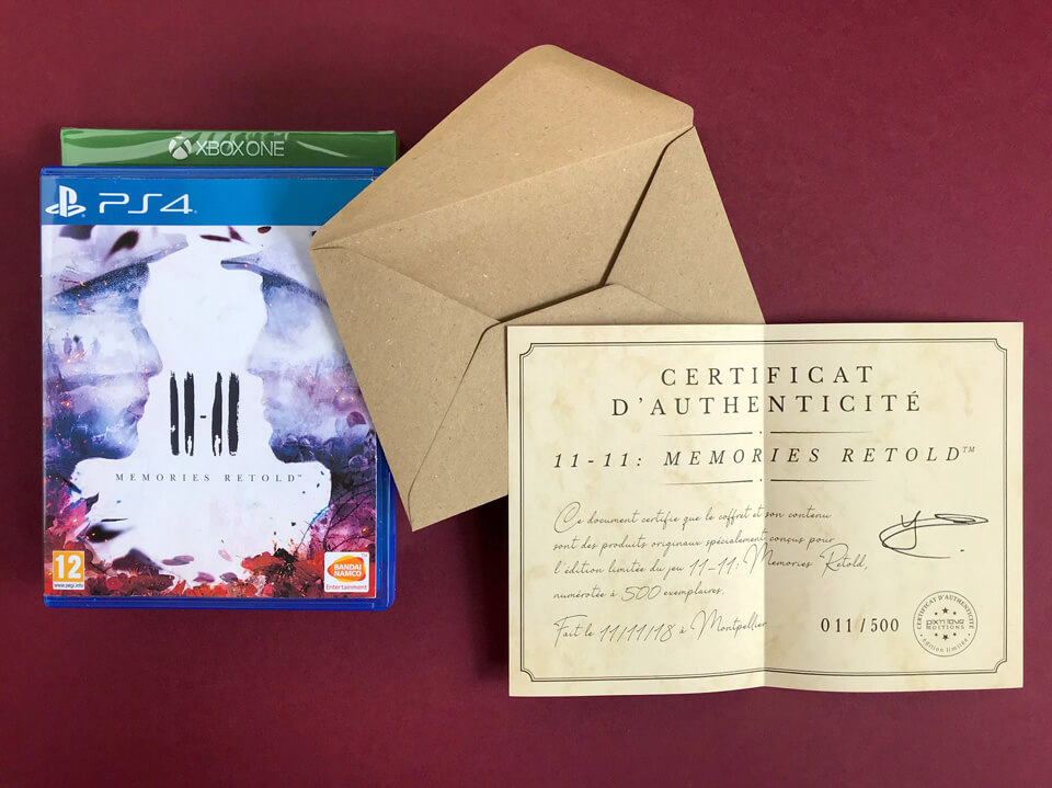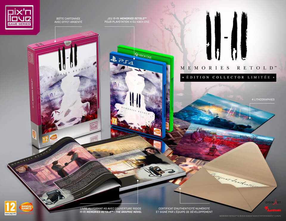 Prévue pour le 9 novembre prochain (date de sortie officielle du jeu), cette édition collector limitée de 11-11 : Memories Retold sera disponible en pré-commande dès demain jeudi 25 octobre 2018 à midi pétant sur le site de Pix’n Love. On ne dispose pas encore du prix pour l’instant, mais comme pour Shenmue cela devrait logiquement tourner autour des 45€.