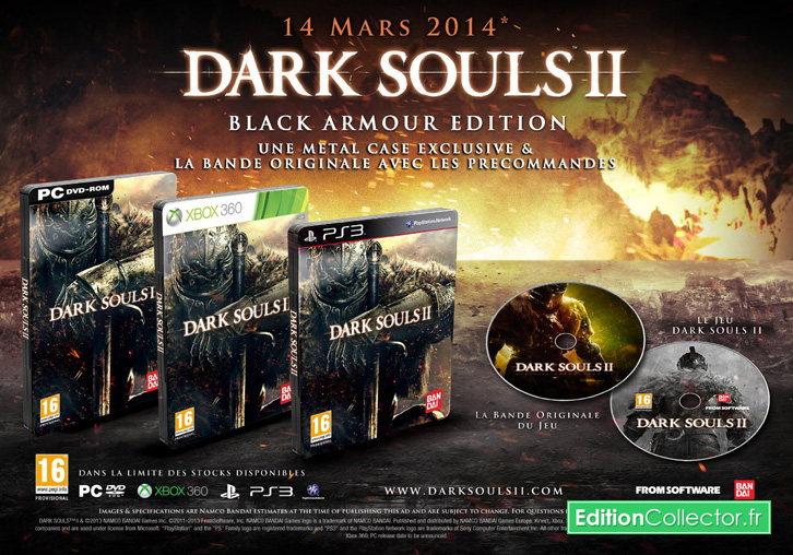 A noté également que Namco a remplacé l’édition standard du jeu par une sympathique édition black Armour. Cette dernière contiendra le boitier steelbook de Dark souls 2 avec à l’intérieur un exemplaire du jeu accompagner de la BO, comme pour le collector en fait. Egalement prévu pour le 14 mars prochain, cette édition est disponible en pré-commande pour moins de 60€ sur Amazon et Micromania. Par contre, attention l’éditeur insiste bien sur le fait que cette dernière sera seulement dispo en pré-commande et ce dans la limite des stocks disponible, sous-entendu réservez maintenant avant qu’il ne soit trop tard. Enfin pour finir, malgré qu’Amazon indique la date du 14 mars prochain pour la version PC, Namco Bandai a malheureusement confirmé que cette version ne sortira pas à cette date, mais peu après courant 2014! Pauv’ PCiste :/