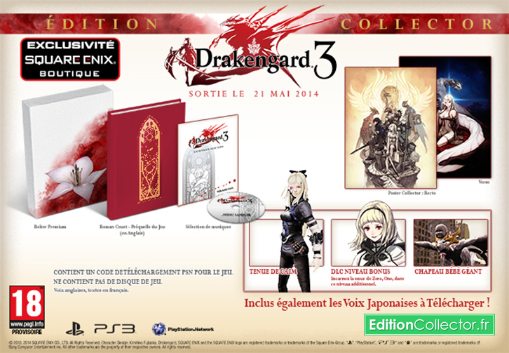 Prévu uniquement en version dématérialisée en Europe, le troisième épisode de la série des Drag on Dragoon, ou plus connue chez nous sous le nom des Drakengard, bénéficiera à l’occasion d’une forte demande des fans au près de Square Enix, d’une jolie édition collector pour Drakengard 3 avec des goodies tout ce qu’il y a de plus physique. Néanmoins, comme c’était déjà le cas pour le collector de Child of Light, cette édition ne renfermera pas de disque, mais seulement un code pour télécharger le jeu en exclu sur le PSN. Malgré tout, cette dernière aura tout de même l’avantage d’être limitée à seulement 2000 exemplaires en France ! Elle renfermera dans une élégante boite ornée de la fleur qui pousse dans l’œil de Zéro, d’un livre illustré de 160 pages entièrement en anglais narrant les événements intervenus avant le début du jeu au travers des yeux des personnages principaux, un CD contenant quelques morceaux de la bande originale ainsi qu’un poster collector recto/verso. Côté bonus dématérialisé on aura droit à une ribambelle de code pour télécharger la tenue de Caim, un niveau exclusif où l’on incarne la One, un chapeau de bébé géant pour notre dragon ainsi que les doublages originaux en japonais. À noter d’ailleurs que les voix japonaises, seront également gratuites pour ceux qui pré-commanderont le jeu standard sur le PSN et qu’elles ne nécessiteront pas moins de 10 Go d’espace libre ! Prévu pour le 21 mai prochain, cette édition collector de Drakengard 3 est d’ores et déjà disponible en pré-commande pour moins de 70€ en exclusivité sur la boutique de Square Enix. Et même si on saluera Square Enix d’avoir fait l’effort de proposer le collector en France, on reste tout de même un peu déçu de se retrouver avec exactement le même collector qu’en Amérique, mais amputé de la galette du jeu.