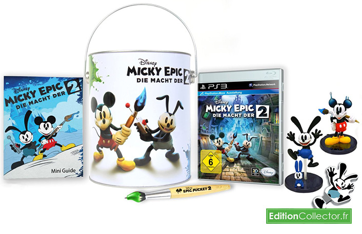 A l’occasion de la sortie de Epic Mickey 2 : le retour des Héros la semaine prochaine, Amazon.de propose une édition collector du jeu de Disney interactive. Celle-ci renfermera 2 petites figurines de Mickey et d’Oswald d’environ 10 cm de haut, une clé USB de 8 Go en forme d’Oswald, un pinceau Epic Mickey 2 avec une brosse bleue ou verte, un mini-guide en allemand de 32 pages le tout rangé dans un joli pot de peinture aux couleurs du jeu. Conçu par le célèbre game designer Warren Spector, le jeu s’annonce aussi sympa que le premier et sortira le 21 novembre prochain, mais il est encore possible de pré-commander cette édition collector pour moins de 70€ sur console HD et 60€ sur Wii. A noté que le jeu devrait également être en français même si malheureusement les goodies restent en allemand avec un joli Miky à la place de Mickey!
