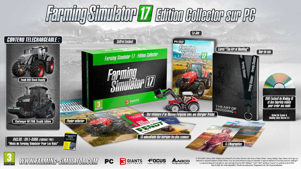 Attendu par des millions de fermiers en herbe, mais surtout par les aficionados des jeux de gestion, le prochain Farming Simulator 17 dévoilé à l’E3 dernier débarquera bien dans les bacs à la fin de l’année sur PS4, Xbox One et PC. Et pour l’occasion, l’éditeur français Focus home interactive nous a une fois de plus concocté une sympathique édition collector.