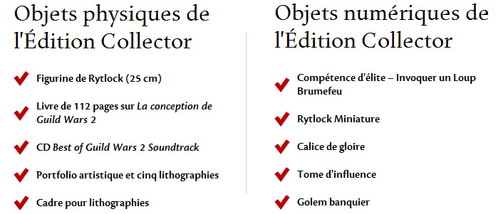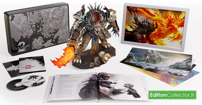 L’éditeur NCsoft et le studio ArenaNet ont dévoilé sur le site officiel de Guild Wars 2 une superbe édition collector pour les fans du jeu. Celle-ci comprendra entre autre une belle figurine de Rytlock, un artbook, la bande son du jeu, un portfolio et quelques lithographies le tout dans une jolie boîte en métal. Evidemment les dlc seront de la partie avec pas moins de cinq contenu supplémentaires à utiliser dans le jeu. Mais ce n’est pas tout puisque pour toute pré-commande du jeu, vous aurez accès à tous les week-end de beta en plus de pouvoir commencer le jeu trois jours avant la sortie officiel ! Enfin, vous recevrez également l’Anneau du héros, un objet virtuel aux nombreux bonus de caractéristiques pour vos perso. Cette magnifique édition collector de Guild Wars 2 sera disponible en pré-commande dès le 10 avril prochain autour des 150€ et malgré son prix un peu élever je suis sûr que les fan du meuporg ne résisteront pas à une aussi belle édition.