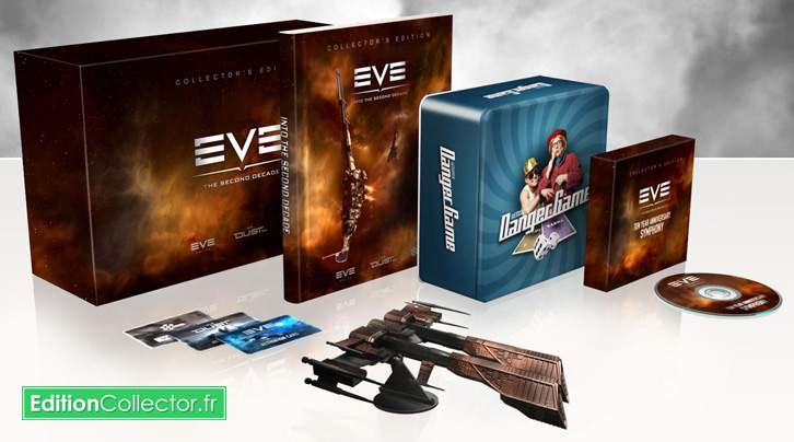 C’est à l’occasion de l’EVE Fanfest 2013 que le studio CCP Games a dévoilé aux fans du monde entier une édition collector pour célèbre le dixième anniversaire de son mmorpg EVE Online. Cette dernière comprendra en premier lieu un superbe bouquin illustré de 190 pages sur l’histoire du jeu depuis sa création jusqu’à l’intégration de DUST 514. On trouvera également dans la belle grosse boite de cette édition une reproduction d’une vingtaine de centimètre de l’un des vaisseaux les plus populaires du jeu avec la frégate de combat Minmatar Rifter. A noté que celle-ci fera également office de hub USB avec 4 connecteurs caché au niveau de ses propulseurs! Viens ensuite le disque de la bande originale du jeu enregistré en live lors du concert symphonique organisé pendant le Fanfest 2013, le jeu de société Danger Game créé par les fondateurs de CCP dans les années 1990 dont les revenus ont permis de démarrer les travaux sur EVE. Celui-ci n’était alors disponible qu’en islandais, mais c’est une réédition traduite en anglais qui sera inclus dans un coffret collector en métal. Comme toujours des bonus in-game seront également les parties avec entre autres des costumes, une capsule en or massif ou encore des armures permanentes pour DUST 514. Enfin pour finir, le bonus le plus intrigant reste la carte mystère avec un code unique qui débloquera des avantages exclusives sur des produits et des événements que le studio dévoilera prochainement. Prévu pour octobre prochain, cette édition collector d’EVE Online est actuellement disponible en pré-commande sur le site de l’éditeur pour moins de 150€.