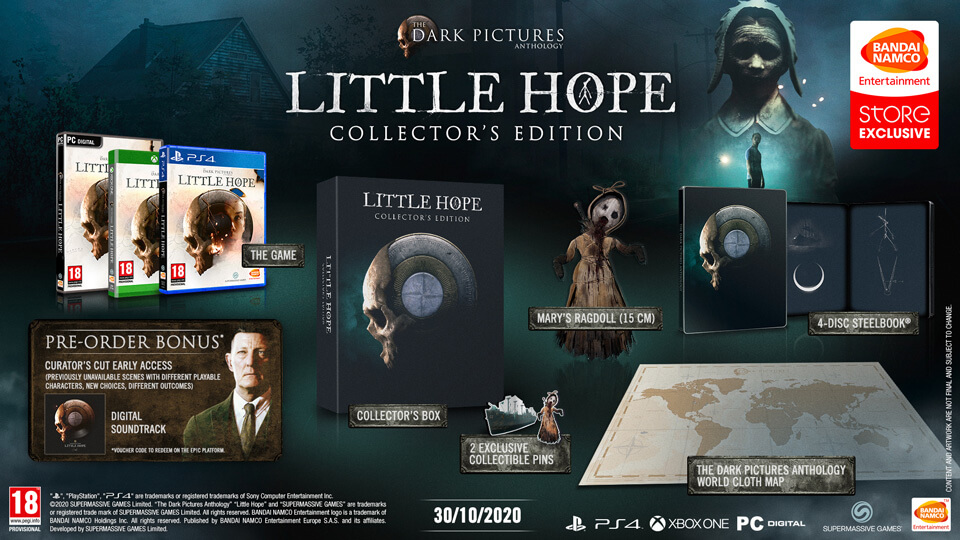 Celle-ci proposera le jeu dans un boitier standard avec en bonus un boitier steelbook, une carte du monde en tissu de l’anthologie The Dark Pictures, deux pin’s exclusif ainsi qu’une petite réplique de la poupée de Mary d’environ 15cm de haut. Le tout sera rangé dans une petite boite collector avec en bonus de pré-commande la bande son en téléchargent, mais également un accès anticipé à la version Curator’s Cut, qui inclut de nouvelles scènes, des personnages jouables alternatifs et des choix et conséquences différents.