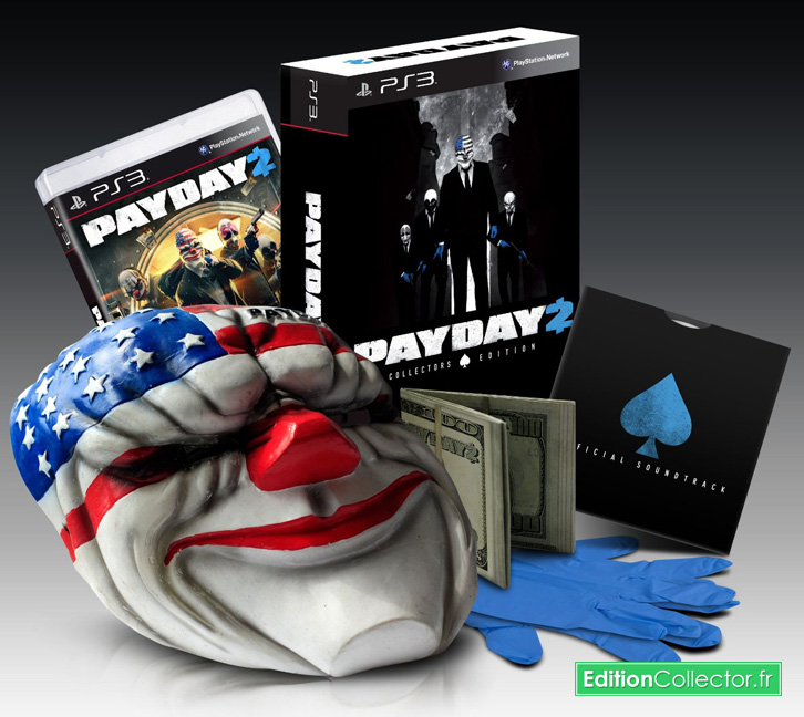 [note color=”#fbf7aa”]Mise à jour 31/07 : Cette fois c’est officiel l’édition collector de Payday 2 est annulé en France! Néanmoins elle sortira comme prévu aux états-unis le 13 août prochain en même temps que le jeu standard. Elle est d’ailleurs encore disponible en pré-commande pour moins de 90$ frais de port et de douane compris (soit environ 67€). En bonus je vous laisse une petite vidéo vine du portefeuille qui sera dans le collector…
