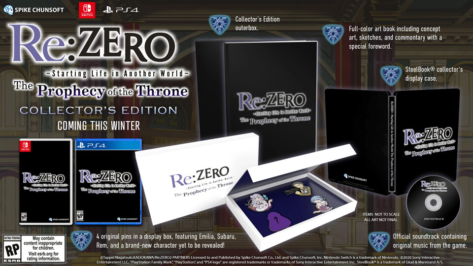 Après un bon petit suspense sur la jaquette du jeu, le site Gematsu vient enfin de dévoiler un nouveau visuel du collector de Re:Zero The Prophecy of the Throne avec les visuels définitifs pour l’artbook, le steelbook, la bande originale et le coffret de pin’s sans oublier la jaquette du jeu !