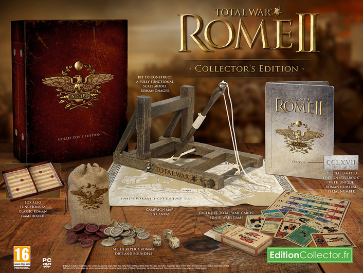 Attendu de pied ferme par les fans de stratégie, Total War : Rome 2 débarquera finalement pour la rentrée prochaine exclusivement sur PC évidemment. Et pour l’occasion The Creative Assembly nous a concocté avec soin une édition collector limitée et numéroté à seulement 22 000 exemplaires dans le monde! Celle-ci contiendra dans une belle grosse boite avec revêtement simili-cuir et logo doré le jeu rangé dans un steelbook exclusif avec une gravure au laser du numéro de l’exemplaire en chiffre romain, des répliques de 3 dés romains retrouvés sur un site archéologique à Herculanum, une carte du jeu avec les territoires à conquérir, un jeu de 58 cartes à jouer exclusif, une réplique d’un onagre (catapulte romaine) de 26cm de long ainsi qu’un jeu romain ancêtre du backgammon avec ses jetons. A noté pour finir que c’est la boite du collector qui une fois déplié en deux fait office de plateau de jeu et que le premier DLC sera offert pour toute pré-commande du jeu. Prévu pour le 3 septembre cette édition collector n’est pour le moment pas encore disponible en pré-commande en France, mais cela ne saurait tarder. Néanmoins, pour se donner une idée du prix on la trouve déjà sur Amazon.de en pré-commande pour 130€. Autant dire que je compte bien ne pas rater cette édition collector qui s’annonce vraiment exceptionnelle avec de nombreux détails qui ferons plaisir aux collectionneurs en plus d’être vraiment très limitée sans parlé du jeu qui devrait être excellent d’après les premiers aperçu.