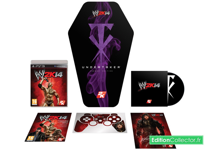 Annoncé il y a un petit moment par 2K games pour nos amis nord-américain, l’édition phenom de WWE 2K14 débarquera finalement aussi chez nous ! Prévu pour début novembre cette édition collector mettra à l’honneur le mythique catcheur The Undertaker pour son grand retour sur le ring cette annéeavec une magnifique boîte métallique en forme de cercueil tout à son image. Pour les anglophobes The Undertaker se traduit par le croque-mort! A l’intérieur du coffret on trouvera bien évidemment un exemplaire du jeu sur PS3 ou Xbox 360 accompagné d’une carte de collection exclusive avec l’autographe d’Undertaker, un skin autocollant exclusif pour décorer sa manette, le film WWE Undertaker : The Streak en combo blu-ray/DVD ainsi qu’American Badass (autre surnom donné à The Undertaker) en personnage jouable. Et pour toute pré-commande du jeu le personnage jouable d’Ultimate Warrior sera également offert. Prévu pour le 1er novembre prochain, cette édition phenom de WWE 2K14 est d’ores et déjà disponible en pré-commande pour moins de 90€ sur Amazon et la Fnac.
